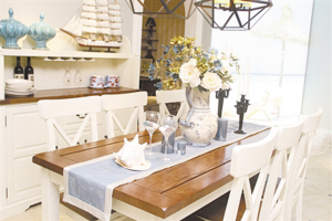 简美风格是近年来流行的一种,对于许多年轻人来说,欧式与中式的家具风格显得繁复,而日式家具风格因过于追求简洁而显得单调,简美风格无疑中和了二者。简美风格的家具简化了仿古风格一些复杂和繁琐的元素,但保持了原有的流畅弧度与线条,使其看起来仍然含蓄而又清新。清新的白色搭配木色显得格外休闲,而餐桌上摆放的蜡烛、花瓶以及餐边柜上的帆船装饰都让这种闲适弥漫在整个餐厅空间里。