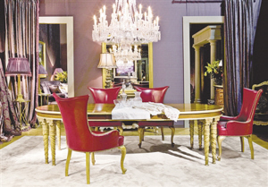 红色与金色的组合呈现出特别的奢华感,纯手工制作让整套家具都多了尊贵的感觉。如果是一个大家族,这种颇具气势的金色餐厅绝对是最好的选择,分长幼次序依次坐好,甚至还有专门的服务人员,这样周到的享受或许就是奢侈生活的一部分吧。巨大而璀璨的水晶吊灯则让整个空间更具尊贵的感觉,更加符合奢华的气质。(刘朗)