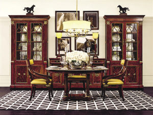 有人说,吃饭就好比一种仪式,是家庭成员间情感交流的一个舞台。在这个餐厅空间里,无论是餐桌、餐椅还是餐边柜,都充满了一种帝政式的风格。这种从古罗马建筑中汲取灵感,通过经典元素的运用,让整个空间都散发出古典和庄严以及高贵的感觉。家具上铜材质的使用突出了格调,而桃花心木搭配各种名贵木皮则凸显了品位。试想一下,当一家人围坐在一起,讨论工作、生活中的趣事,应该是一件特别开心的事。