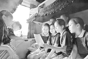 7月22日,农民工子女代表在火车车厢里排练准备为父母表演的节目。