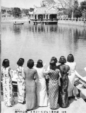 8位穿着各色旗袍的女性在厦门的公园(1939)。