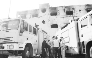 7月28日,在埃及北部盖勒尤卜省,消防人员在发生火灾的家具厂外工作。