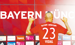 当地时间7月28日,比达尔在现场展示自己的新球衣。当日,德甲拜仁慕尼黑俱乐部与来自意甲尤文图斯队的智利中场悍将比达尔正式签约,比达尔的加盟将填补前拜仁中场大将施魏因施泰格离开后的空缺。新华社发