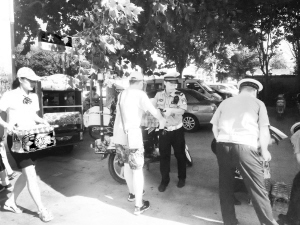 又是一年最热时,在马路上工作的交警和环卫工可谓备受煎熬。有感于交警和环卫工的辛苦,7月29日,爱心学校和公益机构以送瓶装矿泉水的方式,向他们表达了自己的敬意。晚报记者 郭坤 张燕 摄