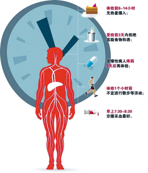 李红玉指出,人的代谢在一天中是波动的,正常人血清物质水平都是以早上8:00左右为基线来定义的,因此应早上7:30~8:30空腹采血,最迟不宜超过12:00。