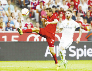 当地时间8月5日,拜仁慕尼黑队球员穆勒与皇家马德里队球员拉莫斯在比赛中争抢。当日,在慕尼黑安联体育场进行的2015年奥迪杯足球赛决赛中,德甲拜仁慕尼黑队以1∶0战胜西甲皇家马德里队,夺得冠军。