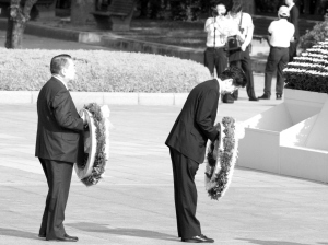 8月6日,在日本广岛和平纪念公园,日本首相安倍晋三(右一)在原子弹爆炸70周年纪念仪式上献花。