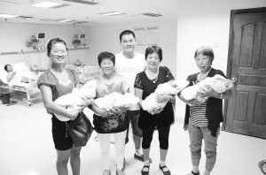 当日9时许,记者来到市中心医院,在3楼的手术室外,看到了焦急等待的屈海琴的丈夫郭俊标。10时许,喜讯从手术室传来——屈海琴剖宫产下四胞胎,老大、老三、老四是女孩,老二是男孩。
