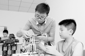 8月9日,老师在山东省枣庄市科技馆指导学生组装机器人。 暑假期间,山东省枣庄市科技馆开设机器人组装课堂,吸引许多学生前来探索学习,锻炼动手能力,体验书本之外的精彩。新华社发