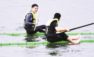 8月10日,海南队选手在60米预赛后交流心得。当日,第十届全国少数民族传统体育运动会独竹漂比赛在内蒙古自治区鄂尔多斯市乌兰木伦湖拉开帷幕,来自全国的50多名选手参与角逐。新华社记者 张爱林 摄