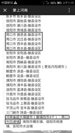 微信朋友圈中的这则消息称,我市鹿邑、沈丘、西华将撤县设市,商水将撤县设区。此外,在“河南省超大镇建市”名单上,我市淮阳县四通镇榜上有名。