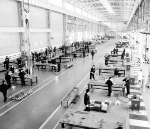 8月12日,在位于河北省大厂县的首钢机电公司护栏分厂车间内,工作人员在制作新护栏。