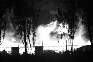 在距离爆炸现场一公里远的一座八层建筑物楼顶,记者看到屋顶有地方已经塌下来,门也变形了。直至13日凌晨3点左右,远处依然能看见火光四射,不时还有一些小的爆炸。