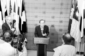 8月12日,在位于纽约的联合国总部,联合国秘书长潘基文对记者讲话。
