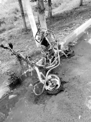 当日18时25分,周口晚报记者赶到现场,此时消防官兵已将火扑灭,现场聚集了许多围观群众。烧毁的电动车躺在路边,此时的电动车已经看不出原有的模样,车身只有铁架还算完好(如图)。