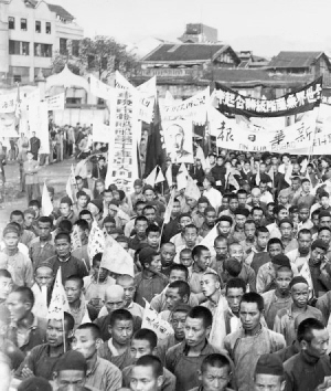 1939年“五一”劳动节,重庆举行国民公约宣誓典礼,矢志抗战救国。图为《新华日报》发动劳工组织参与群众集会。