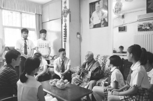 我市93岁的抗战支前模范高魁从北京回家后,9月8日,团市委组织周口爱佑公益、爱心商家等带着慰问品,怀着崇高的敬意来到老人家中。老人说起有关阅兵等事情时,激动不已,在场的人听得也是心潮澎湃。不少人表示,这是一堂很好的爱国教育课。晚报记者 张燕 通讯员 李子 摄