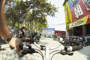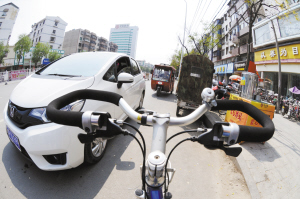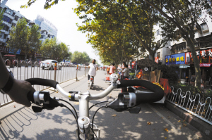 近日,记者用相机捕捉骑自行车难行的各种画面,反映骑自行车时的部分尴尬。