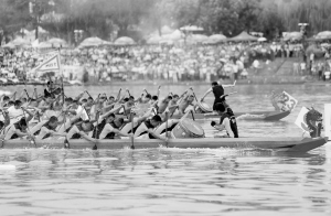 9月21日,在融江广西柳州市融安县城段江面上,参赛的龙舟队员奋勇划桨。