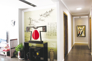 整个空间没有特定的风格,简约现代以及中式元素,在每个空间都完美结合起来。进门位置的左手边和右手边是简约的收纳柜,正对门口的玄观设计给人眼前一亮。玄关背景墙是一幅竹影图,在暗黄灯源下,流露出竹影婆娑的效果;玄关柜呈“回”字形,与中式造型的装饰灯相映成趣,绿色植物点缀其中,给人视觉上的享受。