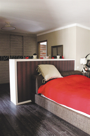 在小两口的主人房中,简约现代风格成为主色调,地板采用了黑色调,透露出冷静稳重的气息,吧台、软床采用了相近色色调,大红色的床品点亮了空间,也流露出主人的新婚喜悦。进门处的书架和单椅给了主人休闲空间,更显舒适自在。