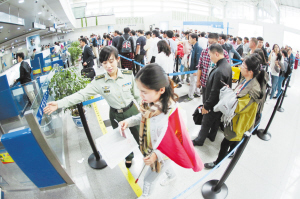 9月30日,边检民警引导一个出境旅行团排队通关。