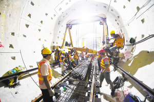 9月30日,在深圳地铁9号线9201标项目部,工人在铺设轨道下的钢筋。