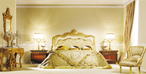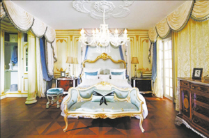 一个真正的女神,必然是“淡妆浓抹总相宜”的。实木拼花的地板看上去有了一份稳重,但浅色调的墙壁和柜子,都给人清淡的感觉。浅色的床和淡蓝色的沙发,面料虽然清新却不失华丽,当然也少不了女神必备的金色边框装饰。