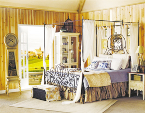每个女人都喜欢与自然亲近的田园风情,木质的墙面摆脱了硬朗的感觉,铁艺的床头做成花边的感觉,床上方垂下的纱幔让人很容易忽略铁质的冰冷,蓝色的床品和靠垫也是接近天空的色彩,映衬窗外的秋景,美不胜收。