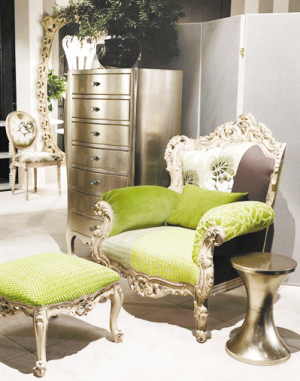 在居室装扮中,清新的色彩、柔软的材质是最容易让人感觉舒适的。绿色的沙发显露出秋天的气息,饱满的水果色彩让人一眼就喜欢。手工雕刻的边框透出淡淡华彩,与素色屏风、七斗柜、梳妆镜、花朵单椅搭配成为居室的美丽一角。