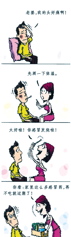 老婆,我的头好痛啊! 先测一下体温。 太好啦!你感冒发烧啦! 你看:家里这么多感冒药,再不吃就过期了!