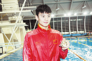 当地时间10月7日,宁泽涛代表中国队选手举金牌留影。当日,在韩国金泉市举行的第六届世界军人运动会男子4X200米自由泳接力决赛中,中国选手祖立军、宁泽涛、俞迎飚、刁基功以7分20秒85的成绩获得冠军。新华社记者 姚琪琳 摄