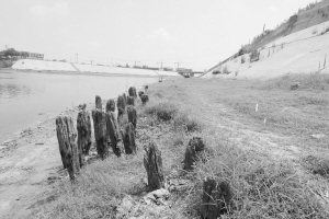 周口晚报记者在沙颍河中州大道桥南岸,沿着滨河路向西走没多远,看见一座石碑,上面写有“大渡口码头遗址”几个字。此外,这里还留有当年大渡口用的木桩。