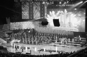 当日,朝鲜在平壤柳京郑周永体育馆举行功勋国家合唱团和牡丹峰乐团的联合演出,庆祝朝鲜劳动党建党70周年。演出持续约一个半小时,万余名观众观看了演出。