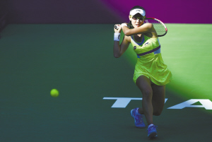 10月12日,中国选手郑赛赛在比赛中回球。当日,在天津团泊国际网球中心举行的2015天津网球公开赛首轮女子单打比赛中,中国选手郑赛赛以0∶2不敌俄罗斯选手叶芙戈尼亚·罗迪娜,无缘第二轮。新华社记者 岳月伟 摄