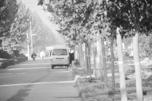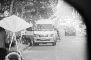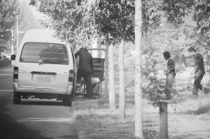 当日8时许,在市区莲花大道上,一辆外地牌照的金杯商务车悄然停在路旁,从车上下来两个人到绿化带中方便。这时,司机从车上搬下一个自制的带有音响的四轮车。方便后的一人趴在四轮车上,打开音响喇叭。随后,金杯车开走(图二),留下一名“瘫痪”乞丐。