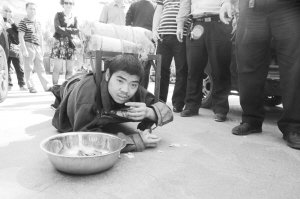 记者注意到,这3个化装成乞丐的人下身都穿着一条又脏又长的黑裤,外面绑有两根麻绳,从外表看来,好像被截过肢。