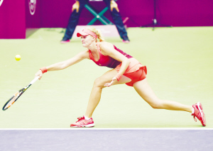 10月14日,法国选手美拉德诺维奇在比赛中回球。当日,在天津团泊国际网球中心举行的2015天津网球公开赛女子单打八分之一比赛中,法国选手克里斯蒂娜·美拉德诺维奇以2∶0战胜波兰选手U·拉德万斯卡,晋级八强。新华社记者 岳月伟 摄