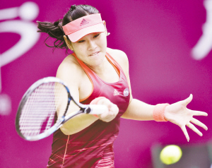 10月15日,中国选手段莹莹在比赛中回球。当日,在天津团泊国际网球中心举行的2015天津网球公开赛女子单打八分之一比赛中,中国选手段莹莹以2∶1淘汰乌克兰选手L·基切诺克,进入八强。新华社记者 岳月伟 摄