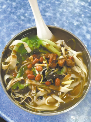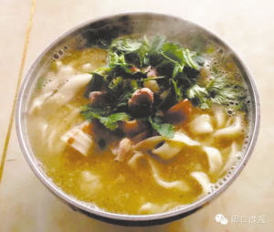 面筋道,汤汁浓,配料有海带、蒜黄、香菜和羊肉等,味道独特,加适量醋和特制辣椒,更鲜美,吃了还想吃。