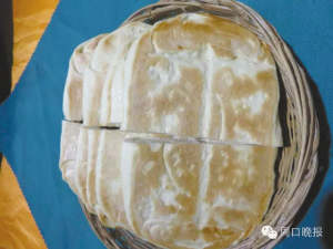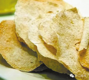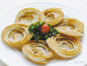 郸城锅盔,又叫铁锅贴,农家多以柴火铁锅加工此饼。饼贴底面焦荑,裹以葱花、麻油,食之焦香松软。