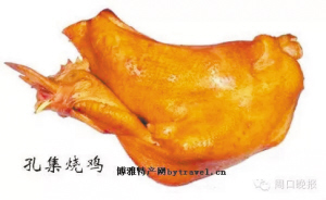 孔集烧鸡,原产地在鹿邑县西孔集,历史悠久。其特点是色泽鲜亮、黄中透红、肉烂而筋脆、肥而不腻、清香诱人。嫩鸡骨头可吃,老鸡骨肉分离,而且盛夏苍蝇不叮,存放数日不坏,并有温中散寒、健脾开胃的药理功效。