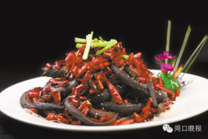 盘龙鳝是一道色香味俱全的名肴,属于豫菜系,选料考究,做工精细。鳝鱼必须选择天然生黄鳝,颜色呈黑褐色,辣椒以红色为宜。做法要经过泡、烫、炸、煸炒等工序。