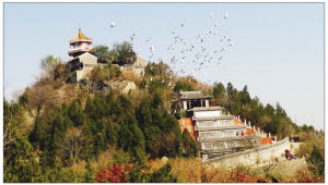 揽枫亭:位于山顶,登亭西眺,太行群峰叠嶂,层林尽染,看漫山红叶苍松翠柏相映,红叶越发艳丽。当日落西山、晚霞红叶交相辉映时,看红叶感觉奇妙。从百望山沿石板路顺西山坡到深谷处有一“红叶仙子”石雕像,可环眺四周山峰。