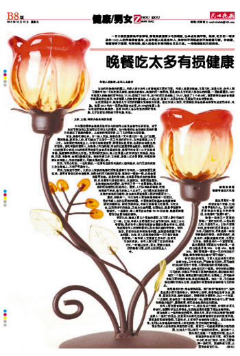 再次,太晚或不定时。大部分上班族的晚餐时间都是跟着工作转的,一加班就要无限延后。肠胃有着自己的生物规律,如果长时间不能按时就餐,甚至饥一顿饱一顿,必然会损伤肠胃功能。总是吃得太晚,也容易导致多余的能量堆积,机体器官代谢负担增大,体重增加。美国调查显示,在晚餐被推迟的同时,还带来了另一个负面影响:根本就没时间做运动以促进消化。通常,人们在准备好晚餐,吃完并清理干净后,差不多晚上9点多了。他们根本就没有时间去散步或做其他运动,这也成为导致美国人肥胖的原因之一。