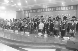 近日,为期5天的周口市文昌中学“启迪智慧,成就大才”国学教育成长营圆满结束。本期成长营特别邀请了国学专家施柳贞作为指导老师。通过5天的学习,学生们表示要从自己做起,做爱的传播者,从尊师孝亲的小事做起,树立远大志向,做一个对社会长远发展有意义的人。据了解,此次成长营是周口市文昌中学对起始年级学生进行系统的道德规范培训。在“办真教育,育真人才”的办学宗旨下,类似这样的培训已经成为了该校的常规工作。图为周口市文昌中学学生为父母捶捶背。记者 王珂 摄