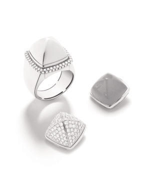 来自Fred可互换式戒指,可依据佩戴者的心情、天气、时间、光线和情绪的变化来更换佩戴的宝石。一枚戒指,三种金色,十四种凸圆宝石,多种组合可随心所欲地搭配,让生命中的任意时刻都绽放出不同的迷人光彩,为佩戴者缔造当下最独一无二的尊贵私享珠宝。