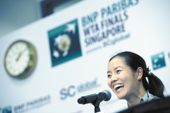 WTA年终总决赛 李娜出席记者会 10月26日,李娜出席在新加坡室内体育场举行的WTA年终总决赛记者会。当日,网球名宿李娜以WTA年终总决赛大使的身份出席记者会。新华社发