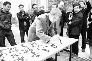 11月2日,在合肥市丁香家园社区广场,书法家张怀馥为“最美家庭”题字。