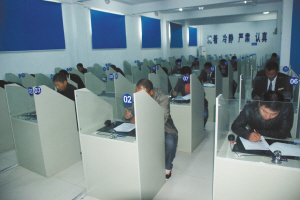 10月31日上午,由周口市驾驶员协会主办的“2015奇瑞杯”驾校教练员技能大赛在周口东方驾校举行。图为教练员技能大赛笔试现场。记者 戚团结 摄